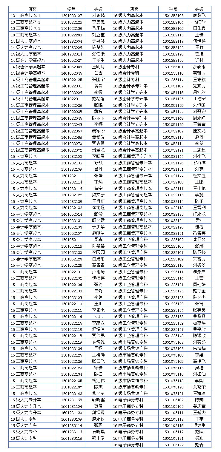 依据《bt365官方网站学生学籍管理规定》第一章第三及第四条、第五章第十五条有关规定,学院对如下学生名单进行公示。逾期不办理手续者,按自动退学处理。